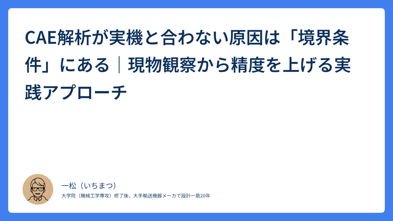 CAE解析が実機と合わない原因は「境界条件」にある|現物観察から精度を上げる実践アプローチ 2026.04.02 アルミ設計 ichimatsu How to 機械設計 ひずみゲージ実測のすすめ|台上評価では見えない応力を発見する「昔ながらの方法」の価値 2026.03.29 アルミ設計 ichimatsu How to 機械設計 FEM解析だけでは疲労破壊は防げない|エンジン設計で見落としがちな「入力荷重」の落とし穴 2026.03.29 アルミ設計 ichimatsu How to 機械設計 鉄とアルミで疲労破面はこう違う|破面観察で破壊原因を読み解く方法 2026.03.29 アルミ設計 ichimatsu How to 機械設計 疲労破壊の原理原則|エンジン設計者が押さえるべき「3つの条件」と繰り返し回数の考え方 2026.03.29 アルミ設計 ichimatsu How to 機械設計 ボルトの強度区分を完全解説|8.8・10.9・12.9の違いと正しい選び方 2026.03.23 締結 ichimatsu How to 機械設計 「スプライン設計の基本|高トルク伝達で失敗しないための2歯受けの考え方」 2026.02.01 歯車 ichimatsu How to 機械設計 スプライン・歯車の熱処理と量産立ち上げの「泥臭い」現実 2026.01.28 歯車 ichimatsu How to 機械設計 予圧が全て:ボルト締結体の「ゆるみ」と「へたり」の物理学とその克服法 2025.11.03 締結 ichimatsu How to 機械設計 教科書を超えて:歯車故障のメカニズム解析と実践的防止策 2025.11.03 歯車 ichimatsu How to 機械設計 もっと見る