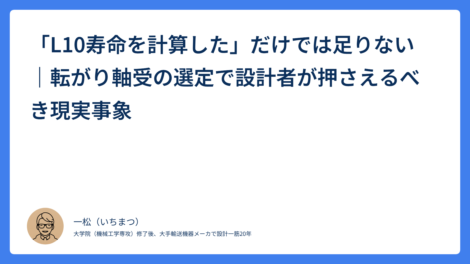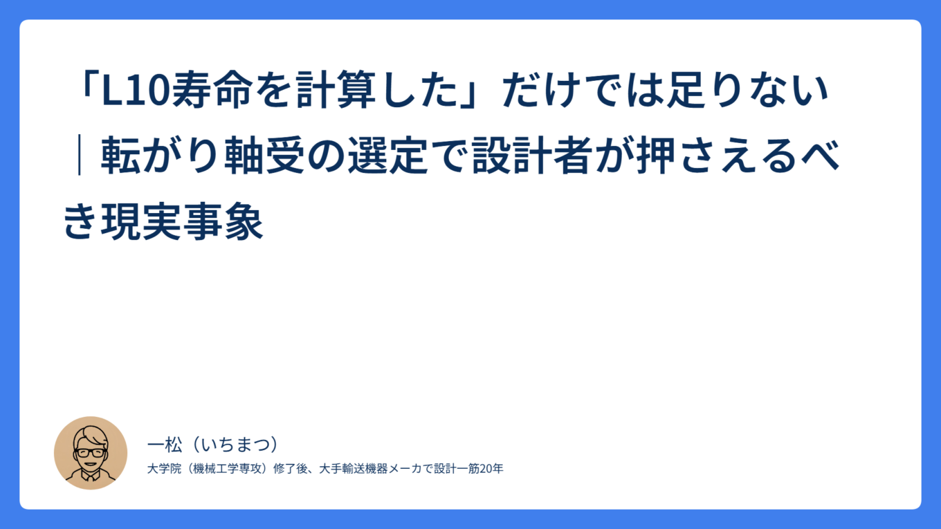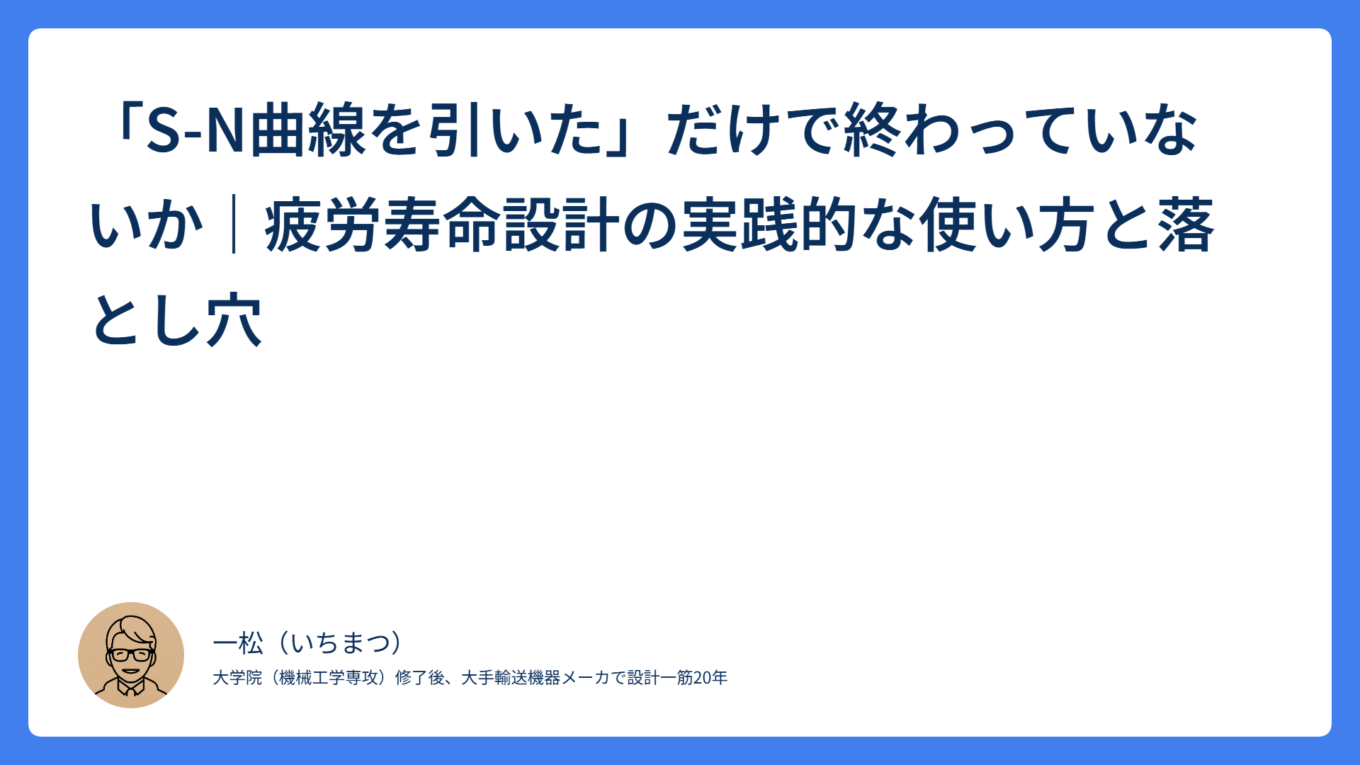 「L10寿命を計算した」だけでは足りない|転がり軸受の選定で設計者が押さえるべき現実事象 2026.04.16 Uncategorized ichimatsu How to 機械設計 「S-N曲線を引いた」だけで終わっていないか|疲労寿命設計の実践的な使い方と落とし穴 2026.04.16 締結 ichimatsu How to 機械設計 複雑なモデルのFEM解析を効率よく精度よく進める「2ステップ法」 2026.04.12 設計一般 ichimatsu How to 機械設計 CAE解析が実機と合わない原因は「境界条件」にある|現物観察から精度を上げる実践アプローチ 2026.04.02 アルミ設計 ichimatsu How to 機械設計 ひずみゲージ実測のすすめ|台上評価では見えない応力を発見する「昔ながらの方法」の価値 2026.03.29 アルミ設計 ichimatsu How to 機械設計 FEM解析だけでは疲労破壊は防げない|エンジン設計で見落としがちな「入力荷重」の落とし穴 2026.03.29 アルミ設計 ichimatsu How to 機械設計 鉄とアルミで疲労破面はこう違う|破面観察で破壊原因を読み解く方法 2026.03.29 アルミ設計 ichimatsu How to 機械設計 疲労破壊の原理原則|エンジン設計者が押さえるべき「3つの条件」と繰り返し回数の考え方 2026.03.29 アルミ設計 ichimatsu How to 機械設計 ボルトの強度区分を完全解説|8.8・10.9・12.9の違いと正しい選び方 2026.03.23 締結 ichimatsu How to 機械設計 「スプライン設計の基本|高トルク伝達で失敗しないための2歯受けの考え方」 2026.02.01 歯車 ichimatsu How to 機械設計 もっと見る